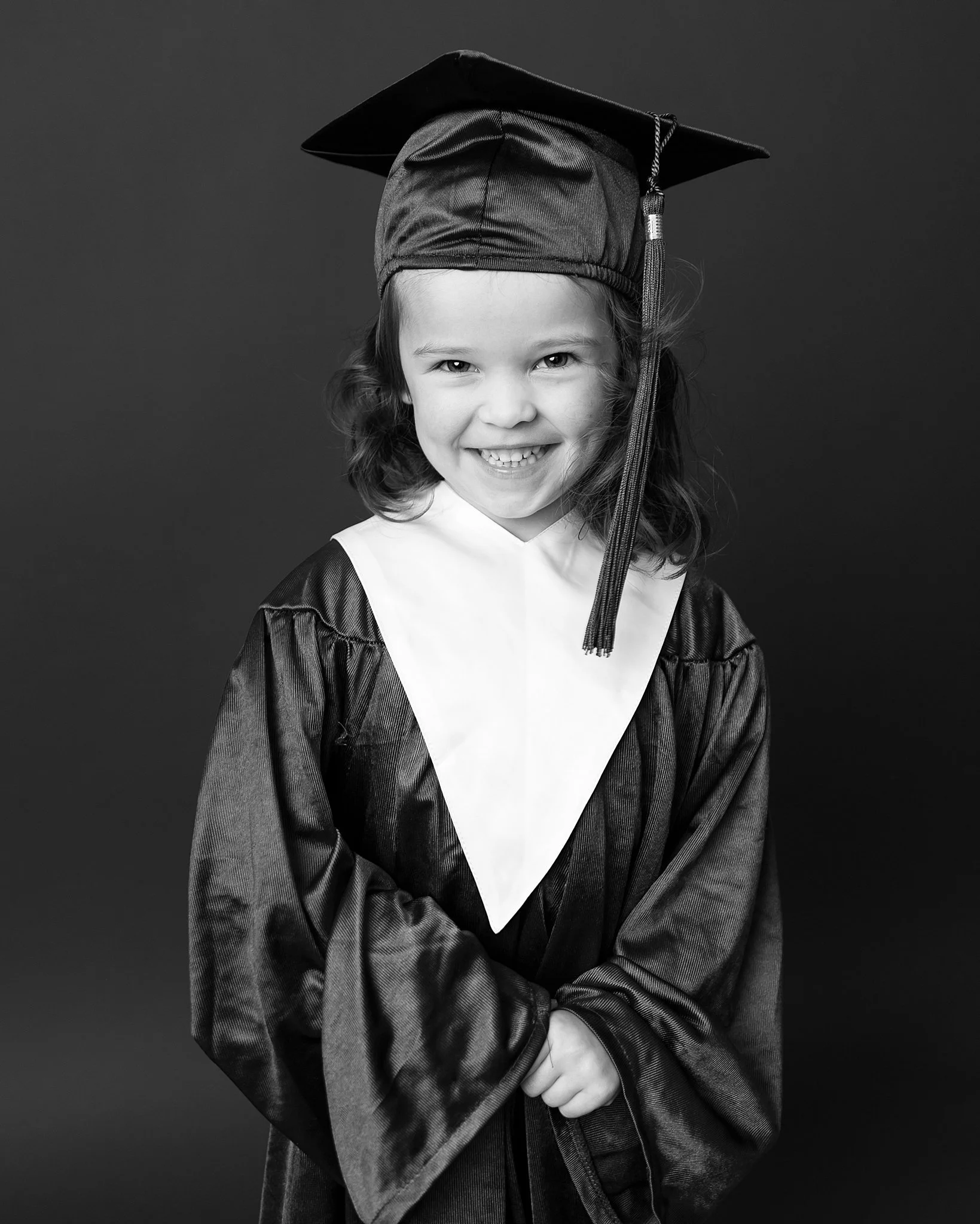 Almost anything goes! I recommend avoiding large graphics on shirts just because they distract from your child. Light and bright colors look best against the dark gray. And it depends on your preference if you’d like for your child to be “dressed up” or if you let them choose something that fits their personality right now. I photograph lots of kids in their favorite outfit (or their parent’s choice) as well as kids dressed up in suits and their fanciest attire. Shoes will typically not be shown in photos unless it’s an infant/toddler.