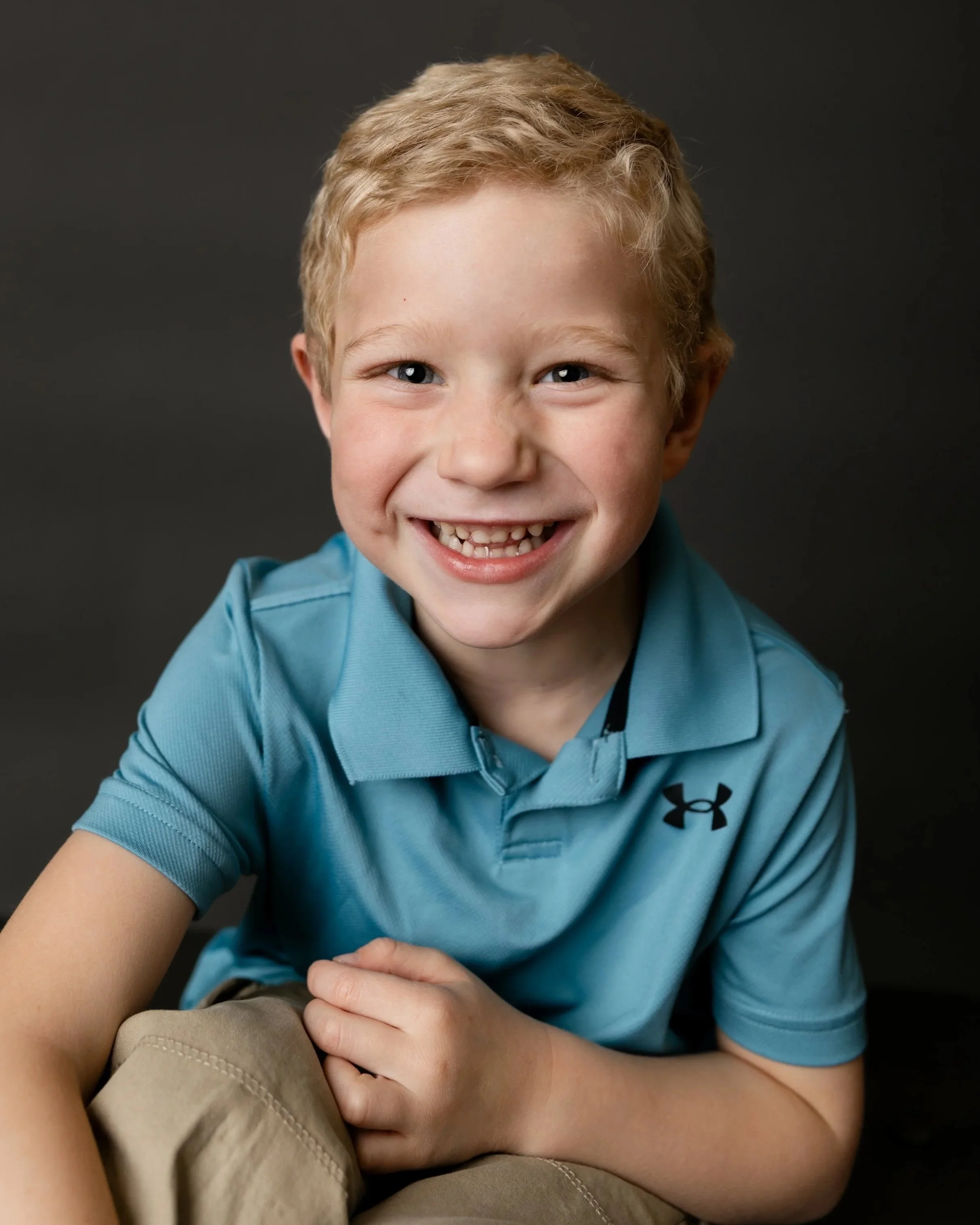 • Almost anything goes! I recommend avoiding large graphics on shirts just because they distract from your child. Light and bright colors look best against the dark gray. And it depends on your preference if you’d like for your child to be “dressed up” or if you let them choose something that fits their personality right now. I photograph lots of kids in their favorite outfit (or their parent’s choice) as well as kids dressed up in suits and their fanciest attire. Shoes will typically not be shown in photos unless it’s an infant/toddler.